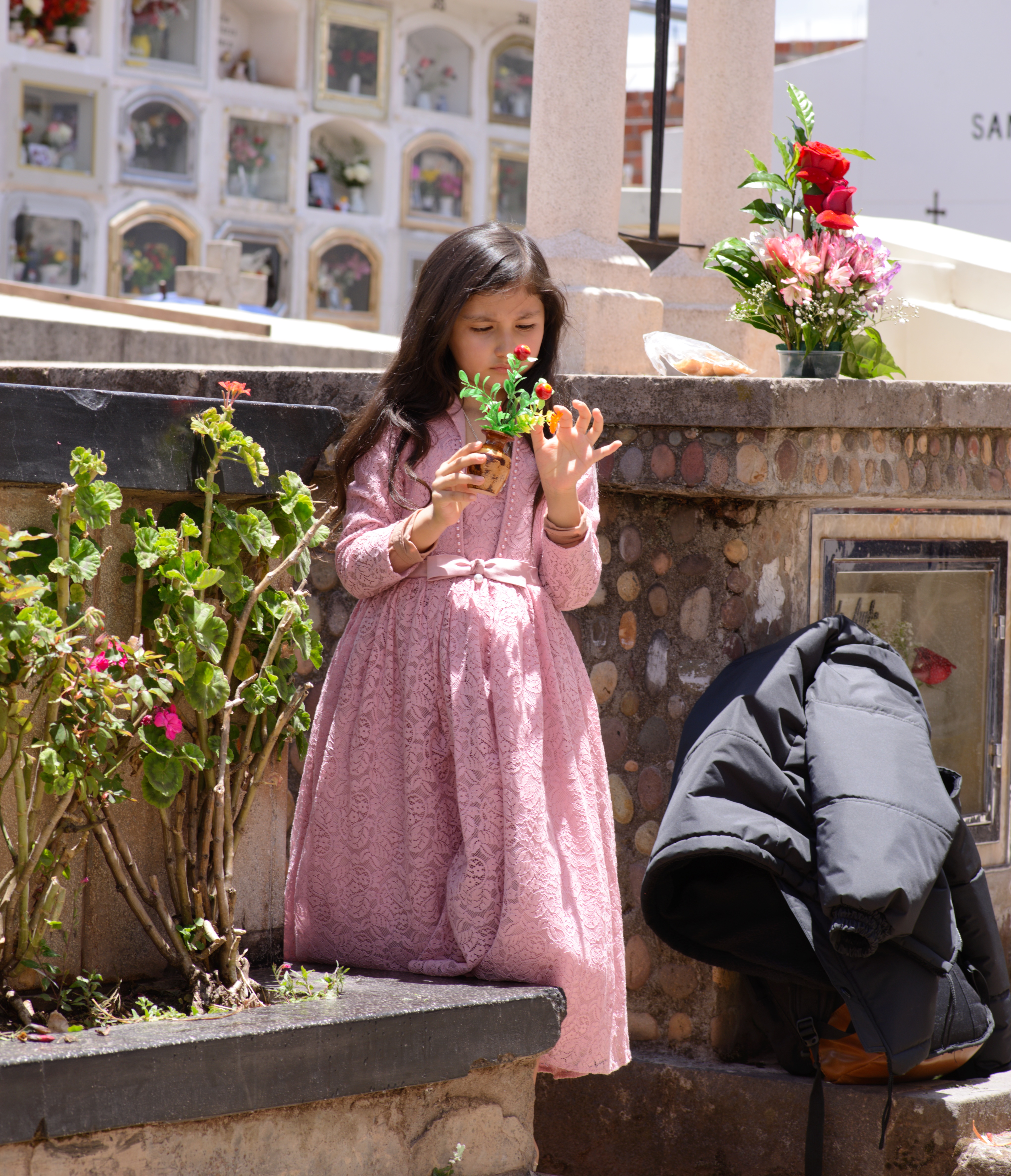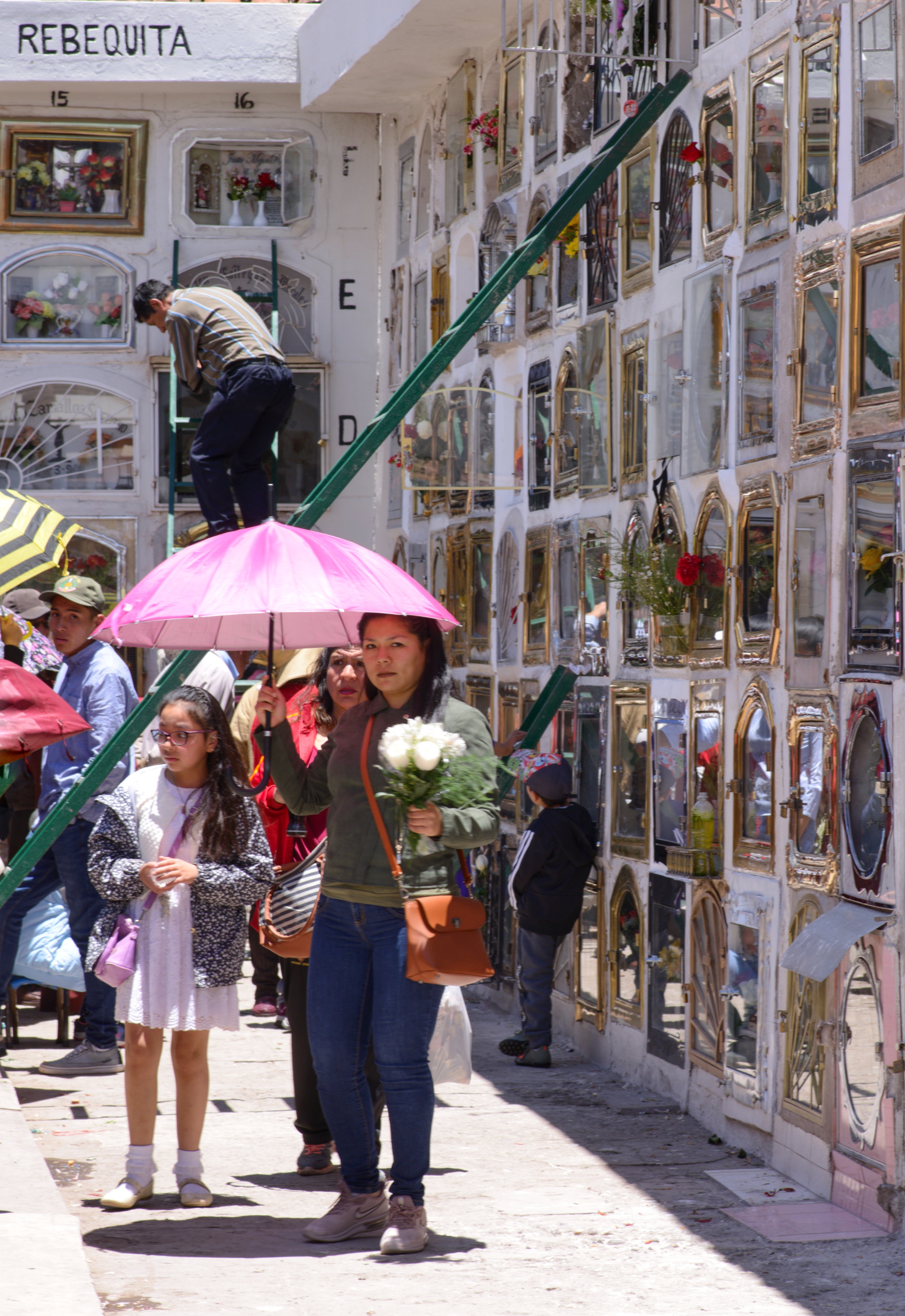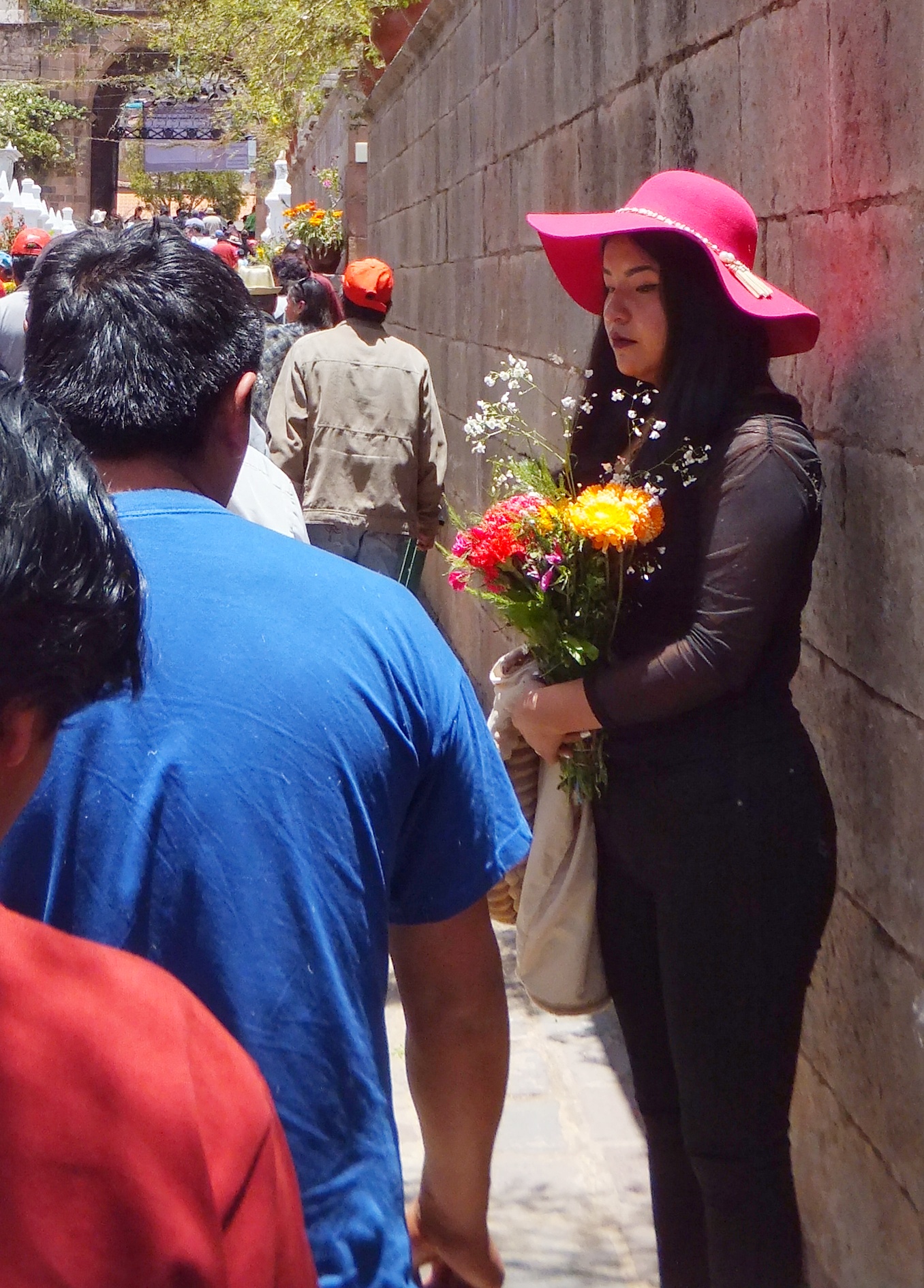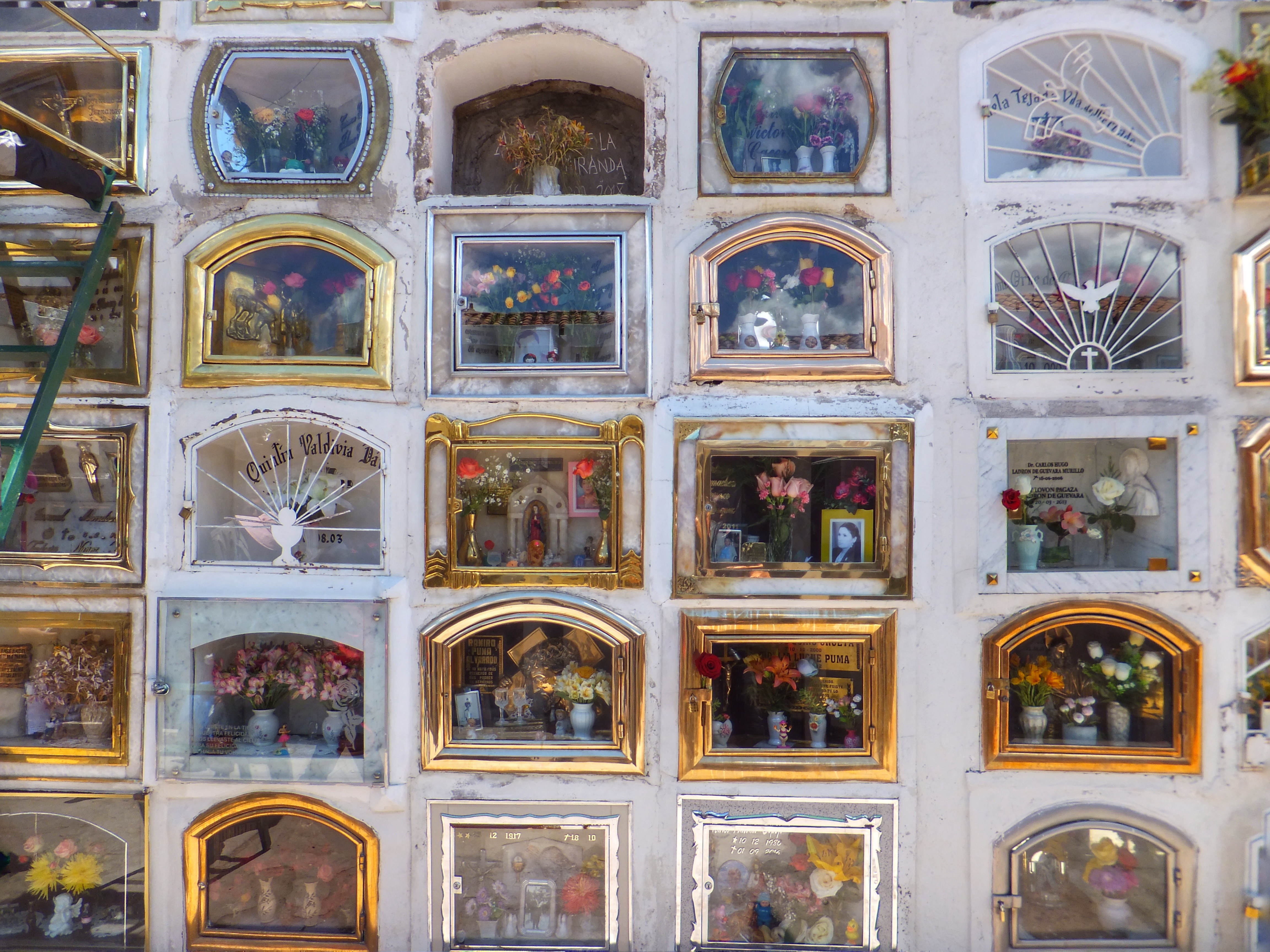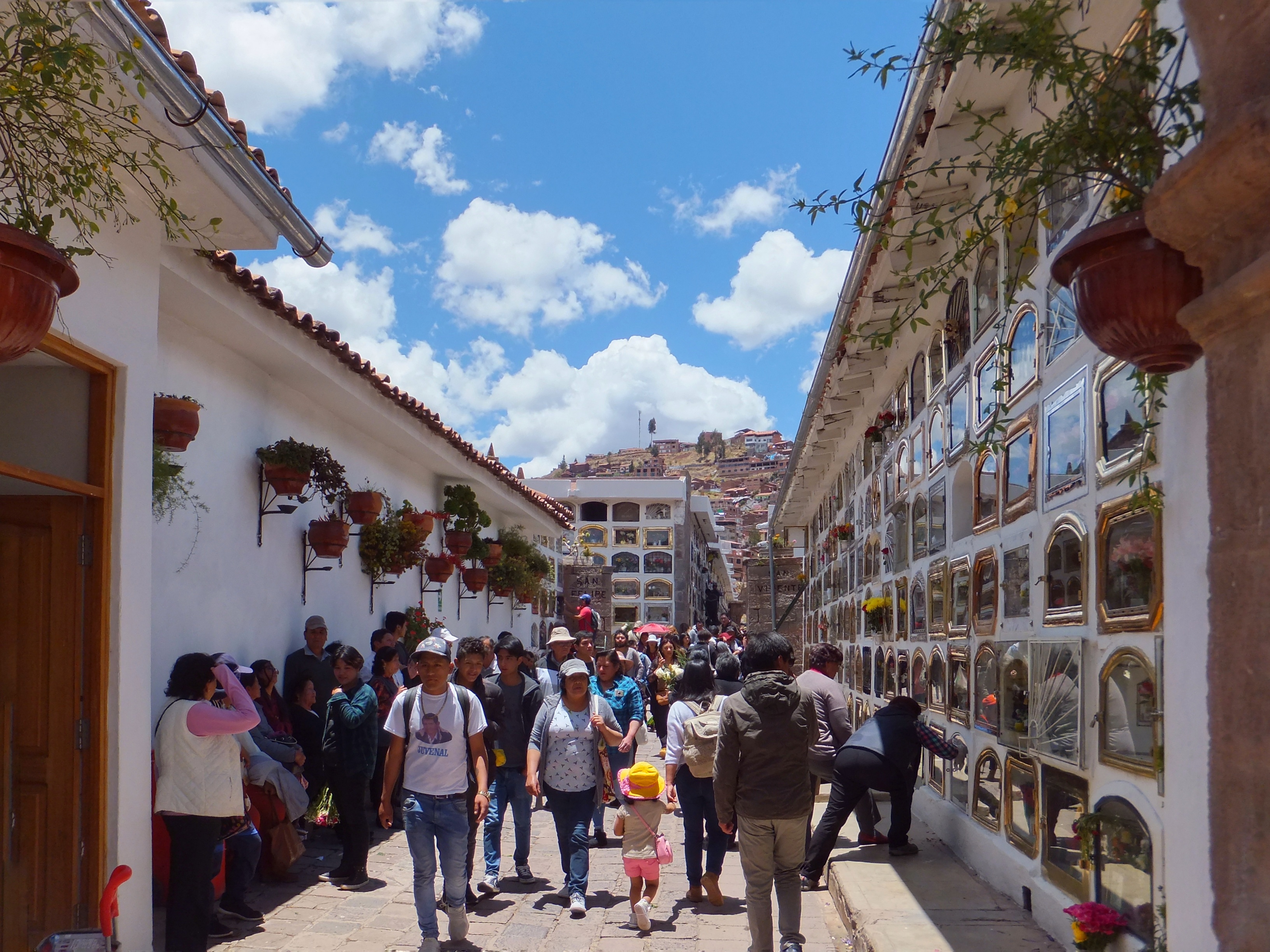 Unser Bus nach Ollantaytambo, wo wir unseren Zug besteigen würden, fuhr erst nachmittags los. So hatten wir noch genügend Zeit, einen schönen alten Friedhof zu besuchen. Auf den Straßen war schon wieder sehr viel los. Blumenverkäufer überall und hektische Menschen, die sich in Taxen und Collectivos drängelten. Auf dem Friedhof wurden die Fenster der Gräber poliert. In den Gräbern waren überall kleine Gaben zu sehen. Bier, Cola, Chicha, etc. aber auch Brot, Kuchen und ähnliches. Kitschige Plastik-Wackelfiguren wackelten vor sich hin. Allerdings ging es besinnlicher zu, als wir es erwartet hatten. Über einen der vielen Märkte gingen wir wieder zu unserem Appartement zurück, schnappten unsere vorbereiteten kleinen Rucksäcke und gingen dann zur Inca-Rail-Station an der Av. del Sol, wo wir unsere Wartezeit mit Kaffee, Keksen und Kuchen versüßten. Pünktlich fuhr uns unser Kleinbus nach Ollantaytambo, einem niedlichen Ort, der ein wenig an einen Skiort erinnert. Nach einer kurzen Wartezeit wurden wir zum Zug geleitet, der uns dann in knapp 2 h nach Aguas Calientes brachte. Beim Einchecken im Hotel bekamen wir noch Hilfe mit unseren Tickets für Machu Picchu, die wir nicht ausgedruckt hatten. Dann gingen wir endlich zum Essen. Es war immerhin schon kurz vor 22:00 Uhr. Wir teilten uns eine vegetarische Suppe (Gemüse gibt es hier sehr wenig) und eine sehr leckere Fajita. Als wir fertig waren, fing es kräftig an zu regnen. Hoffentlich wird es morgen besser. Dann gingen wir schlafen, denn morgen dürfen wir wieder sehr früh aufstehen.