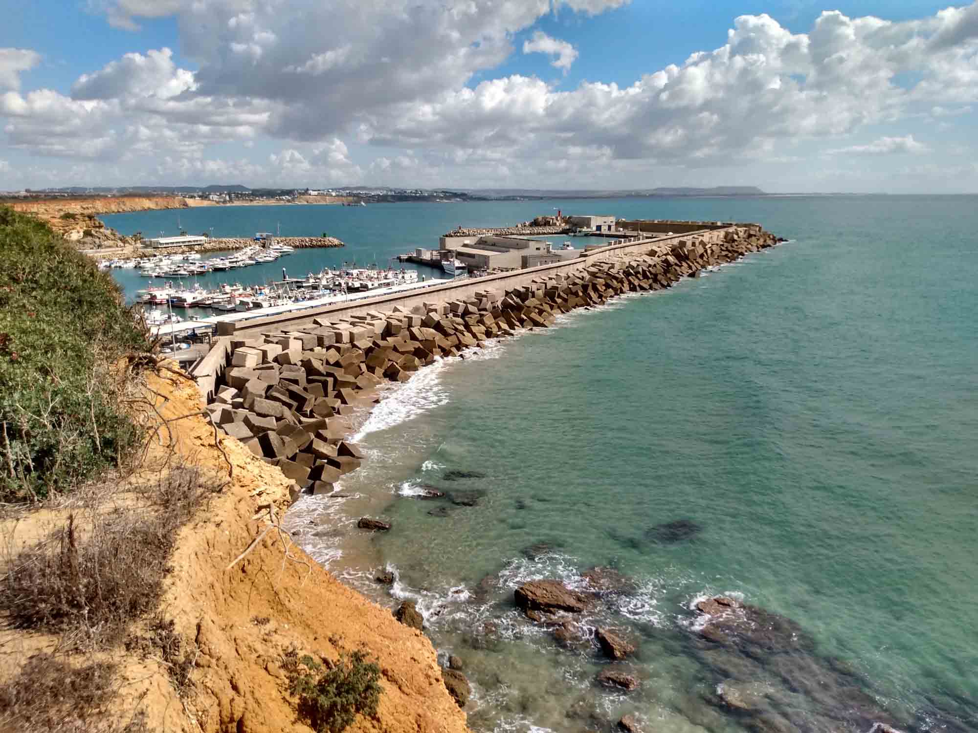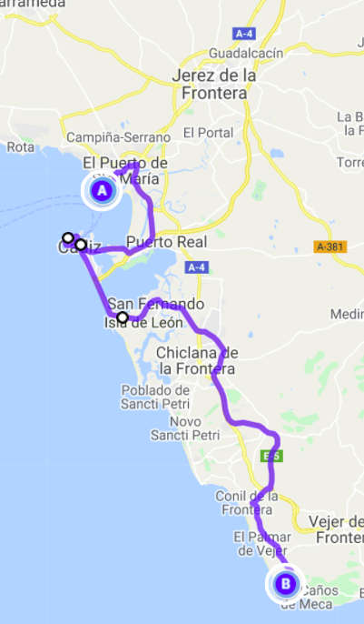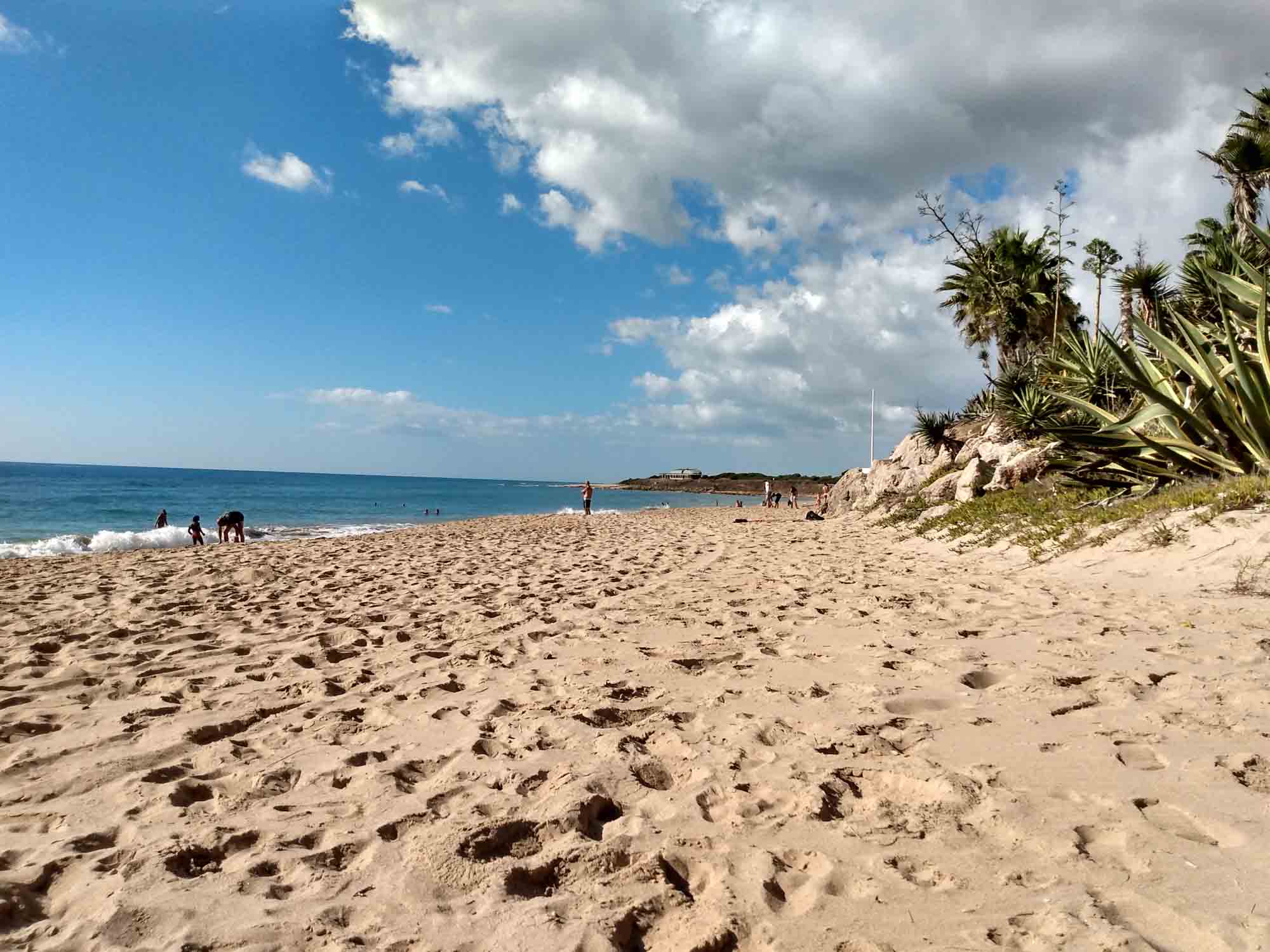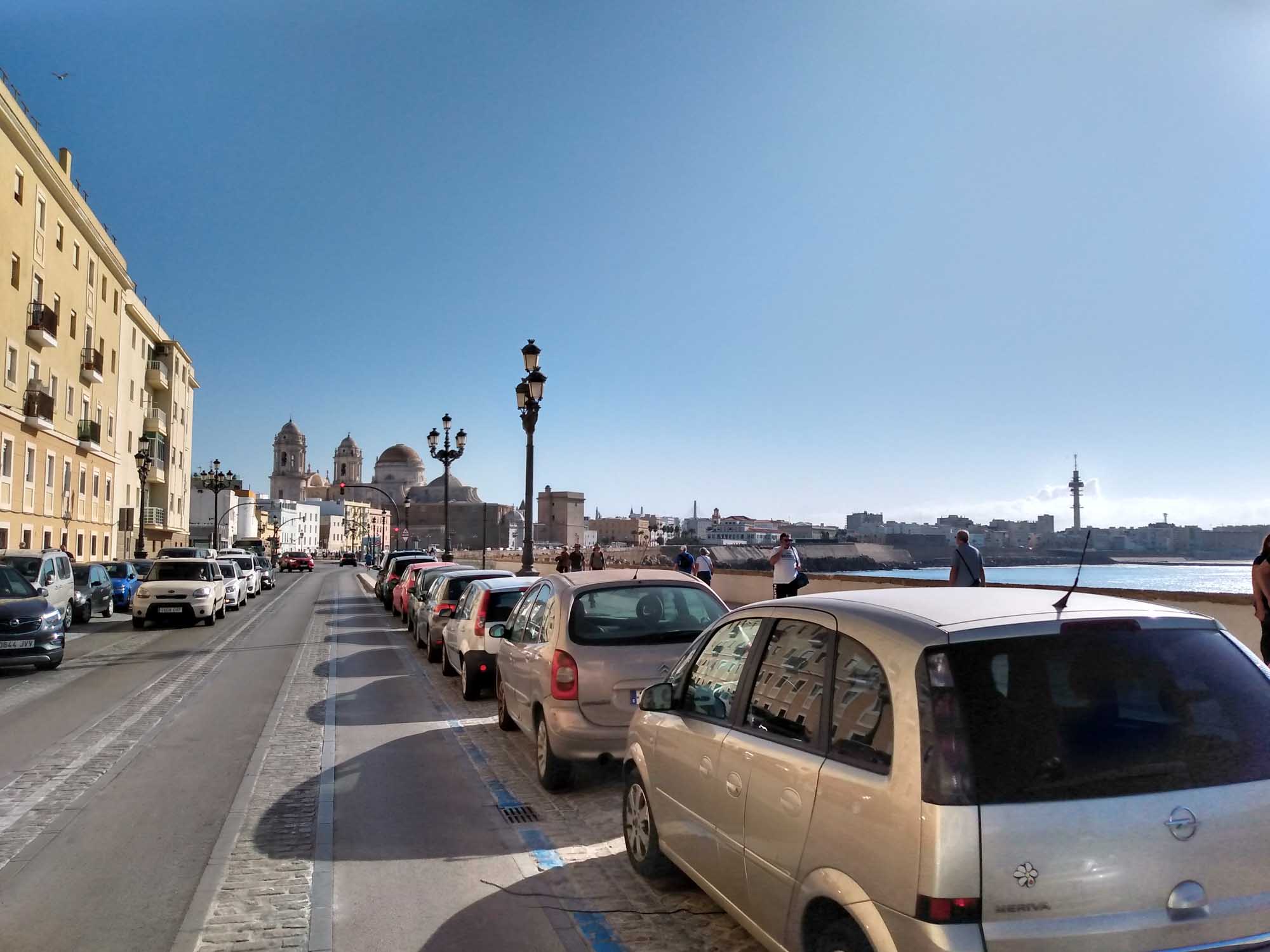 Es war eigentlich ein ein sehr schöner Platz, wo wir übernachtet hatten. Den Strand gleich vor der Windschutzscheibe und wunderbar ruhig in der Nacht. Zumindest solange, bis sich morgens um 2 Uhr eine Gruppe Jugendlicher in einem Auto direkt hinter uns stellte und einige Linien Kokain durchzog. Bei offenen Türen waren sie recht ausgelassen und laut und wir schliefen in der Nacht etwas weniger. Entsprechend müde waren wir am Morgen. Wir entschieden uns weiterzufahren, da wir am heutigen Samstag mit einer Wiederholung rechneten. Über Cadiz, wo wir mangels sicherem Parkplatz nur eine Stadtdurchfahrt machten, fuhren wir die Küste entlang gen Süden. In Cadiz kamen wir an der Kathedrale vorbei, die ebenfalls auf muslimischen Mauern steht und mit Sicherheit sehenswert ist. Ansonsten ist es eine große Stadt, die den engen Raum auf der Halbinsel vollständig ausfüllt. Im Hafen lagen einige Kreuzfahrtschiffe, von denen wir einige bereits von der anderen Seite aus ein- und ausfahren gesehen hatten. Die Küste besteht zum Teil aus steil abfallendem Lehm mit kleinen, vom Wasser aus erreichbaren Buchten aber auch einigen sandigen Abschnitten, an denen es schöne Strände gibt. Einen davon, den Strand von Zahora suchen wir uns aus, parkten auf einem großen privaten Parkplatz und verbrachten den Nachmittag am Strand. Abends blieben wir gleich dort und hofften auf eine ruhige Nacht. Zumindest hofften wir, dass die Musik aus der Nachbarschaft irgendwann aufhören und der Hahn am nächsten Morgen nicht zu früh krähen würde.