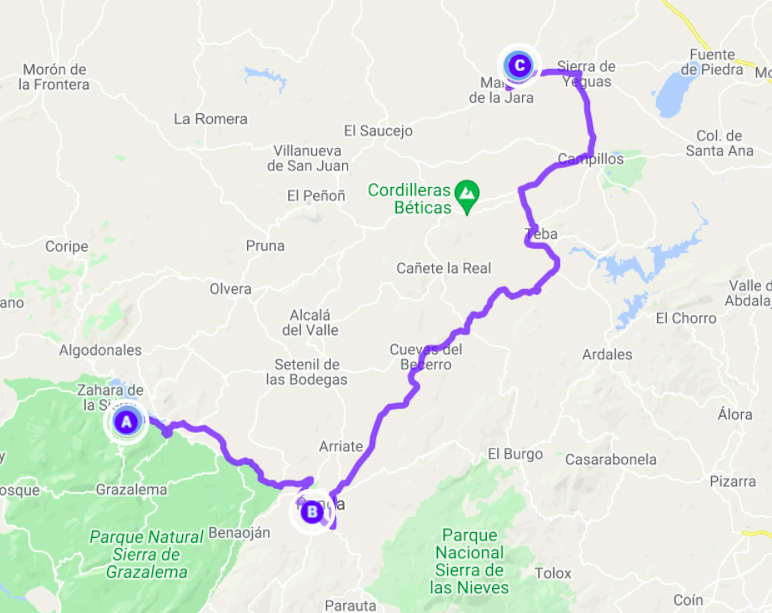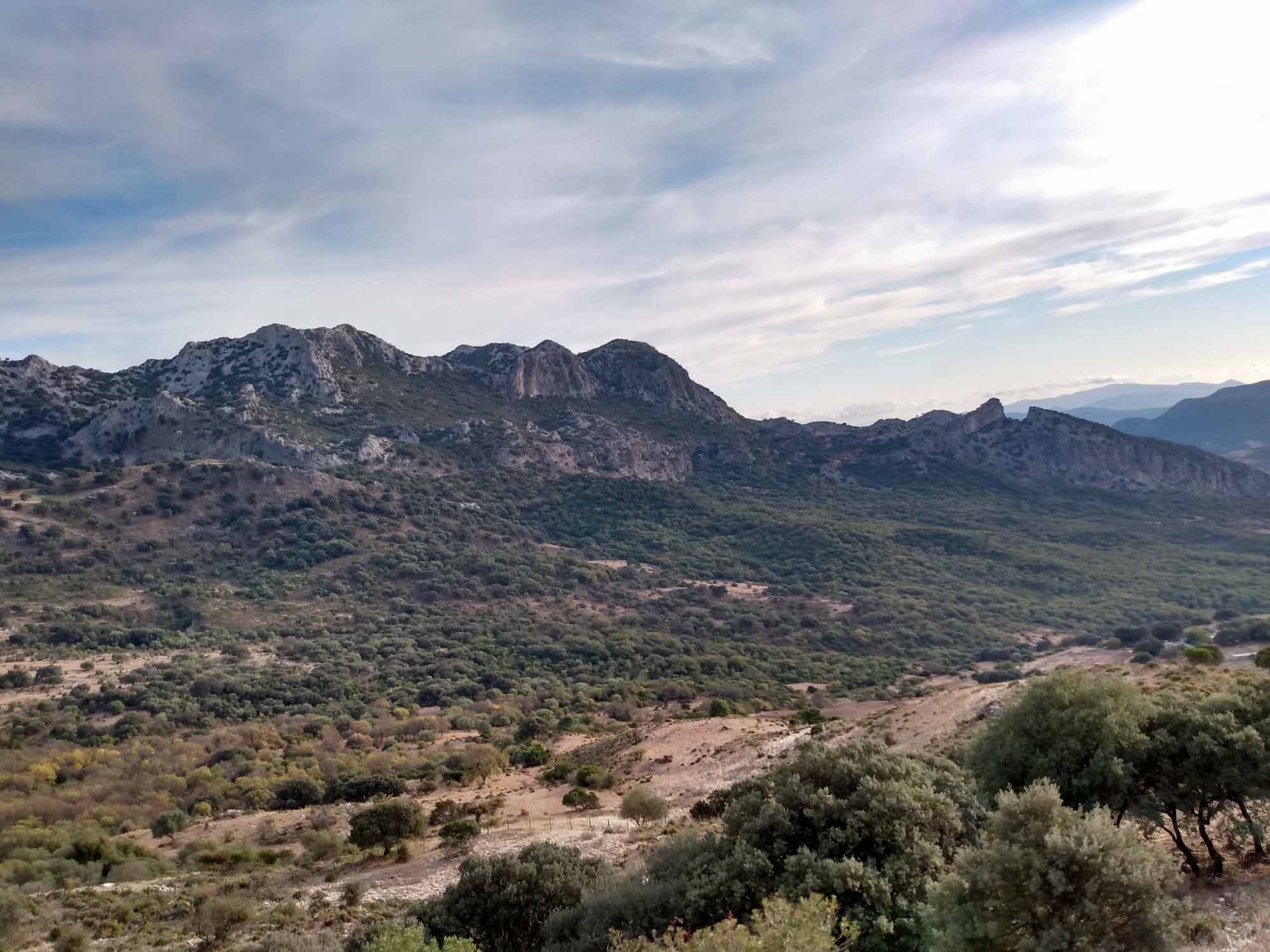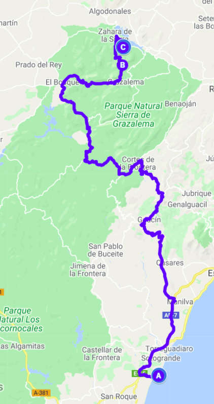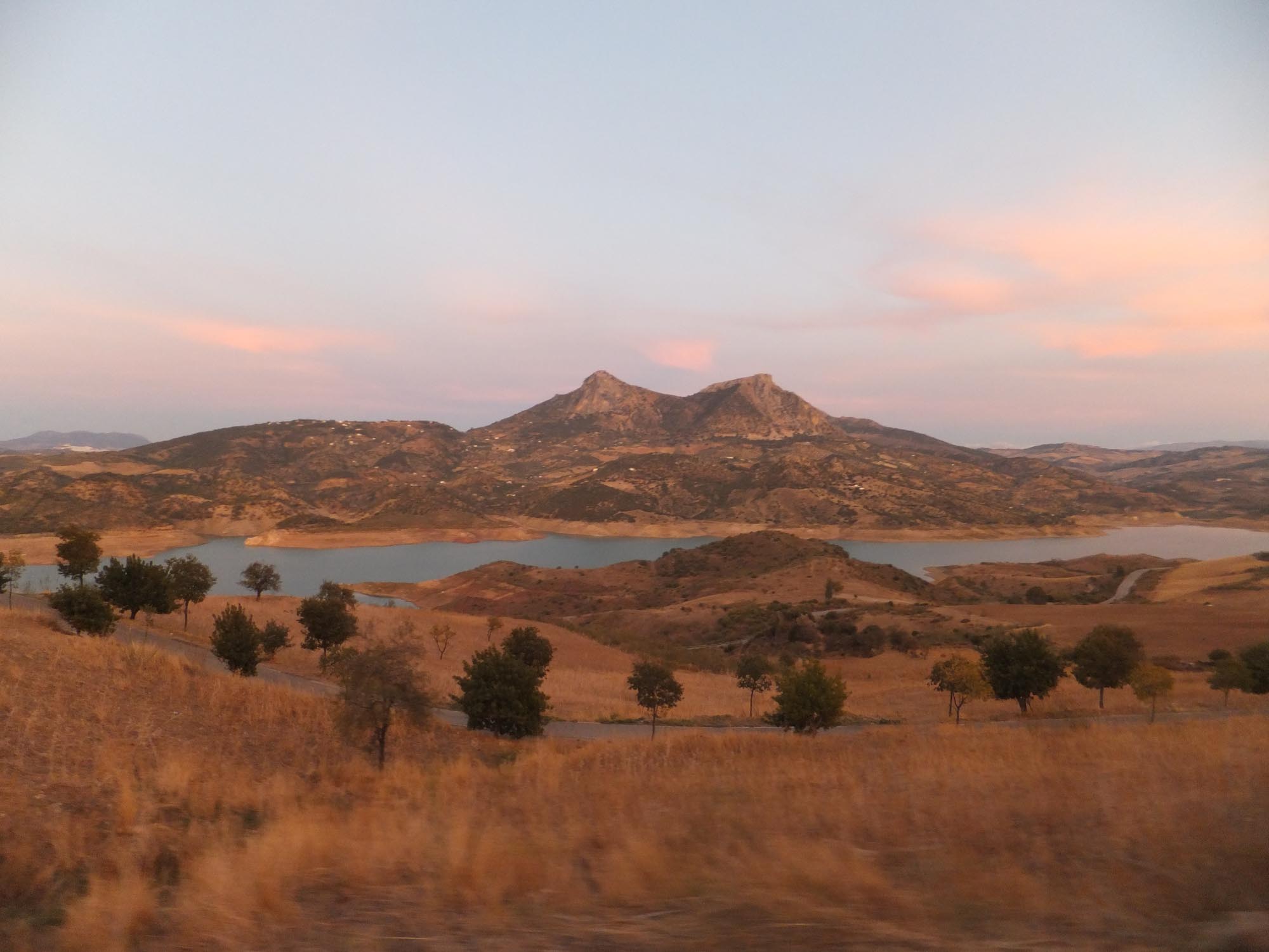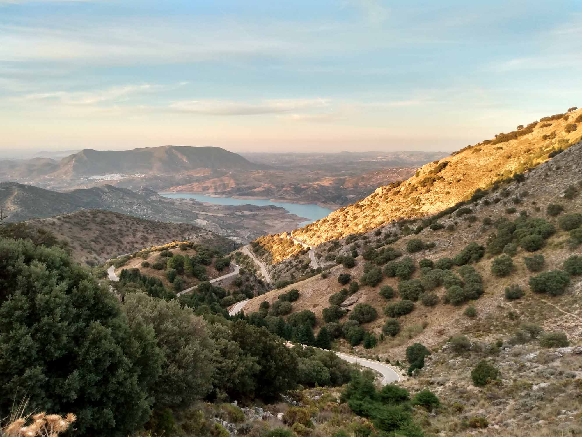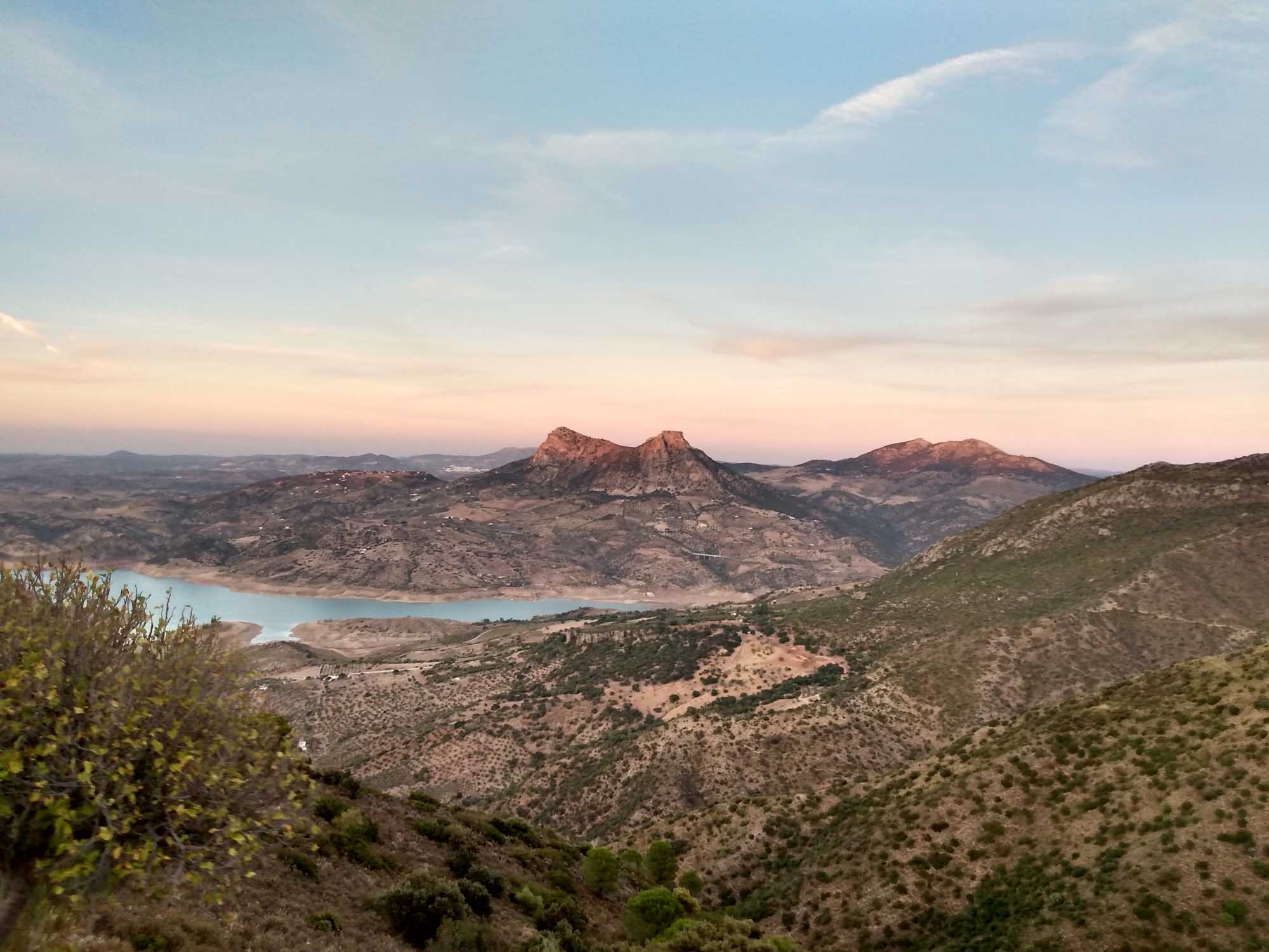 Unser heutiges Ziel war der Puerto de las Palomas, der mit 1357 m höchste Pass in Spanien. Wir fuhren also wieder ins Inland in die Berge. Auf mal wieder sehr kleinen Straßen ging es durch den Parque Natural Sierra de Grazalema, einem großen Waldgebiet mit wunderschönen uralten Korkeichen. Immer wieder ging es in Serpentinen einen Berg hinauf und auf der anderen Seite wieder hinunter nur um kurz darauf wieder hochzugehen. So arbeiteten wir uns langsam nordwärts und erreichten den Pass zur goldenen Stunde, also kurz vor Sonnenuntergang. Noch schöner als der Pass und die Aussicht von dort war allerdings die Fahrt wieder herunter zum Stausee bei Zahara de la Sierra. Hier kam das Licht der inzwischen untergegangen Sonne besonders schön zur Geltung. Unseren Schlafplatz fanden wir dann auch recht zufällig am Rande des Stausees auf einem Besucherparkplatz eines Naturums, der natürlich um diese Zeit vollkommen leer war. Hoffen wir mal, dass die Tür am Eingang des Parkplatzes morgen früh auch noch offen ist.