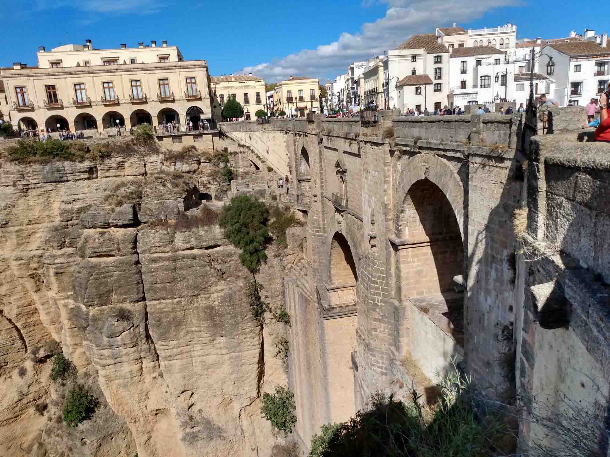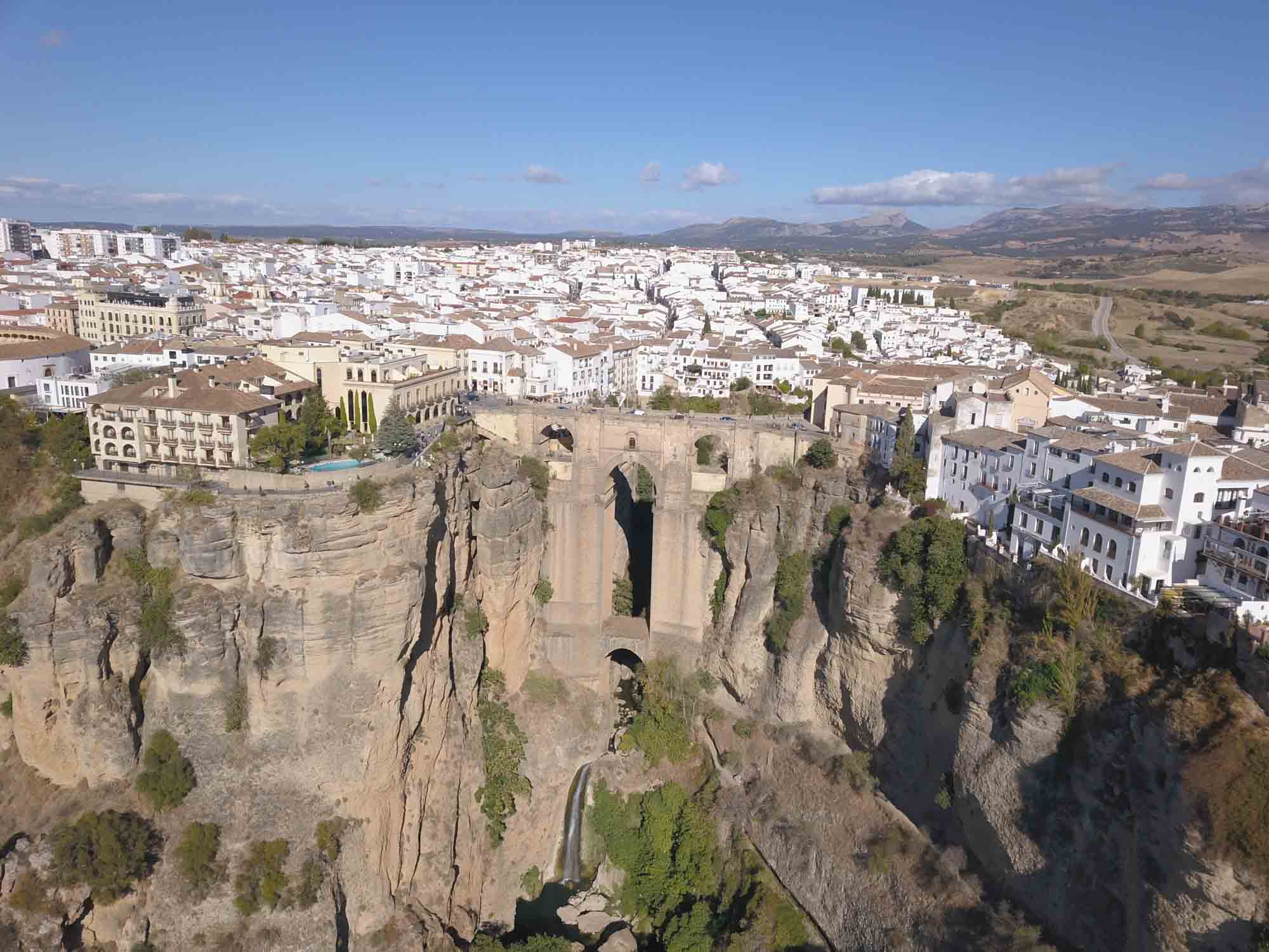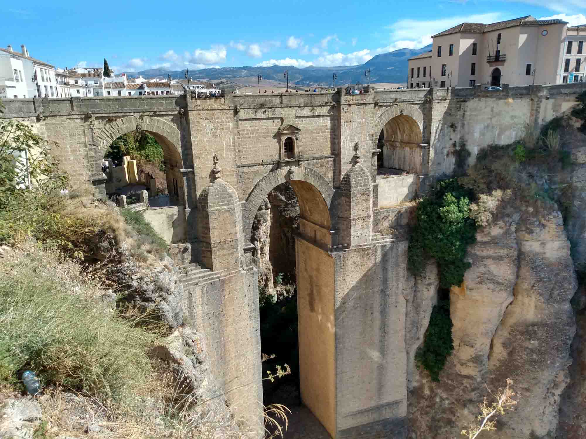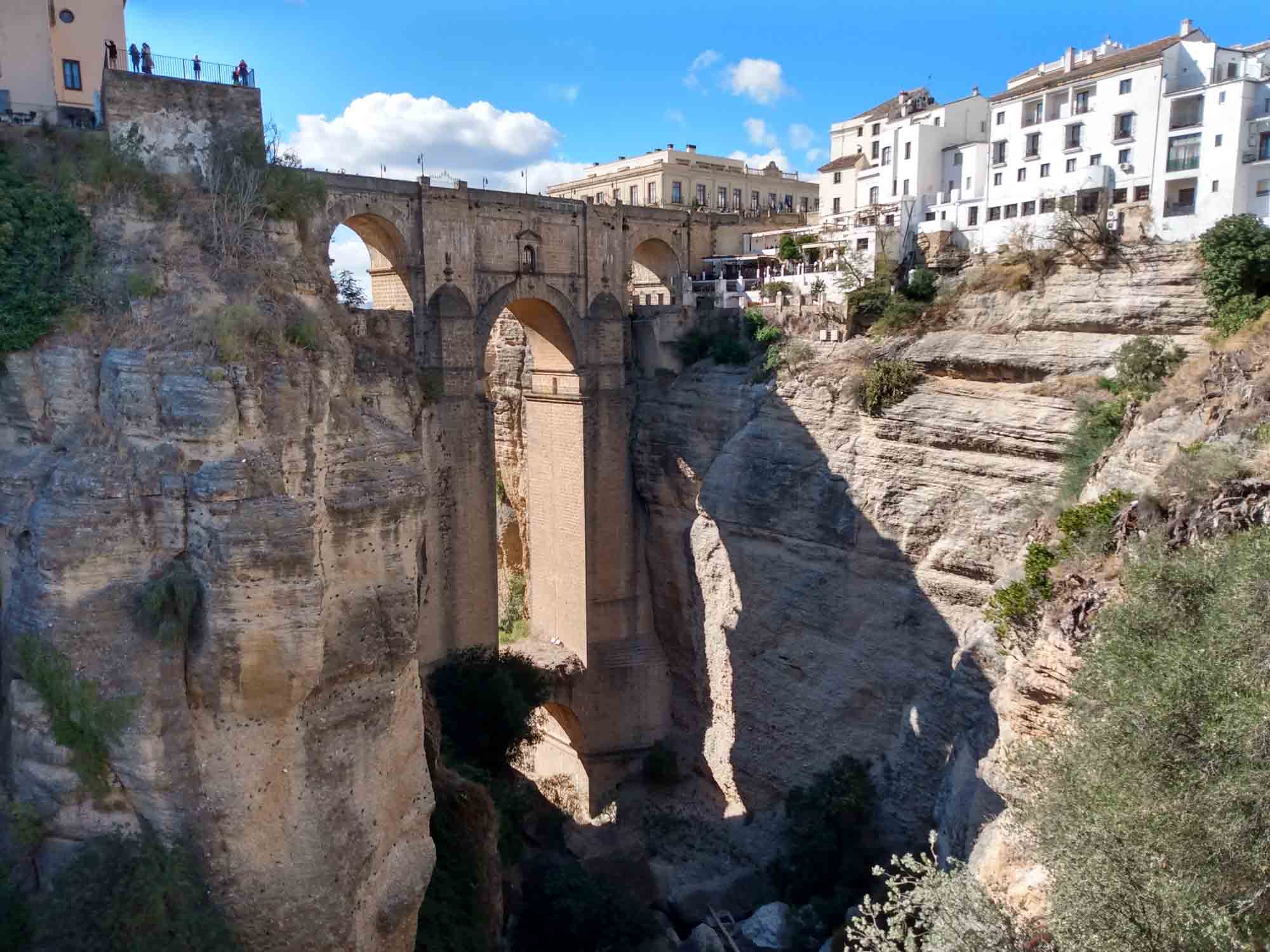 Die kurze Fahrt nach Ronda war unspektakulär. Der Weg durch die Stadt, die auf einem Hochplateau liegt und durch eine 100 m tiefe Schlucht geteilt ist, die der Fluß Guadalevin gegraben hat, dagegen schon mehr. Auf der schmalen Straße kamen uns relativ viele Autos entgegen, die zum Glück aufmerksam genug waren, an passenden Stellen zu halten. Obwohl in Spitzenzeiten bis zu 75.000 Besucher am Tag in diese kleine Stadt strömen, gab es keine größeren Parkplätze. Wir fanden für unseren Kleinen eine Lücke in einiger Entfernung zur Altstadt. Dorthin gingen wir dann zu Fuß. Die Iglesia de Santa Maria la Mayor schauten wir uns nur von außen an, genauso wie die Stierkampfarena, eine der ältesten in Spanien. Ronda ist als der Geburtsort des Stierkampfs bekannt. Wir aber waren vor allem wegen der neuen Brücke hier, die den Guadalevin überspannt und die beiden Teile der Stadt verbindet. Etwas weiter unterhalb gibt es dann noch eine alte Brücke und direkt darunter noch eine Brücke aus der Zeit der Mauren. Aber erst die neue Brücke, die im 18. Jahrhundert gebaut wurde, ermöglicht einen ebenerdigen Übergang zwischen den Stadtteilen. Von der Brücke hatten wir einen schönen Blick über das Land aber die richtige Ansicht gibt es natürlich von unten. Also gingen wir zum Auto zurück und fuhren einen jetzt wirklich schmalen Weg, der zudem relativ steil war auf Kopfsteinpflaster in das Tal hinunter. Nach dem ersten Drittel dann der Schock: Ein Auto parkte so ungünstig, dass an ein Durchkommen eigentlich nicht zu denken war: Rechts noch ein Verteilerkasten und dahinter der Straßenrand mit einem Absatz von ca. 15 cm. Zurück wäre es nur rückwärts gegangen und das mit der rauchenden Kupplung hatten wir ja schon. Also vorwärts und irgendwie passte es dann doch. Unten angekommen packten wir unsere Drohne aus und machten eine schöne Aufnahme aus der Luft. Dann mussten wir leider wieder zurück. Diesmal hatten wir Pech mit dem Gegenverkehr. Kurz nachdem wir die steilste Stelle passiert hatten, standen, weil sie gerade den Wagen vor uns durchgelassen hatten, ein PKW und ohne Abstand dahinter eine Gruppe Motorräder so im Weg dass wir nicht weiterkamen. Zudem war auf der rechten Seite ein Olivenbaum, so dass wir auch nicht ausweichen konnten. Zurück ging auch nicht, da wir an der steilen Stelle, die wir gerade hinter uns gelassen hatten, nicht wieder hätten anfahren können. Nach kurzer Diskussion versuchte der Fahrer des PKWs etwas Platz zu machen. Der Motorradfahrer dahinter war jedoch weniger kooperativ. Demonstrativ fuhr er direkt vor unser Auto, quetsche sich dann zur Fahrerseite durch, ließ ein paar italienisch klingende Haßtiraden durch unserer offenes Seitenfenster ab und fuhr dann, mit seinen Seitenkoffern unser Heck knapp verpassend, wütend weiter. Aber jetzt hatte der PKW genügend Platz und nach kurzem Rangieren kamen wir durch. Dann kam die Stelle, an der wir bei der Herfahrt schon unsere Probleme hatten. Es war eng. Sehr eng. Aber es gelang uns, gerade noch auf dem Asphalt zu bleiben, kurz vor dem unglücklich parkenden Wagen wieder einzuscheren und den Verteilerkasten mit 2 cm Abstand zu passieren. Das letzte Stück war dann kein Problem mehr. Von der Ausfahrt trennten uns jetzt nur noch der Transporter vor uns und der LKW von Repsol, der in ein Haus Gasflaschen lieferte. Das Ganze beschleunigte sich erheblich, als der Ambulanzwagen, der hinter uns aufgetaucht ist, seine Sirene anschaltete. Dann hatten wir es endlich geschafft. Danach fuhren wir zum Einkaufen und zu unserem nächsten Nachtlager an einem zu dieser Jahreszeit ausgetrockneten See. Wir liefen Abends noch bis zu einem Pegelmesser, der unweit des Ufers im Boden steckte. Danach machten wir uns ein kleines Abendbrot und entspannten uns von den Ereignissen des Tages.
