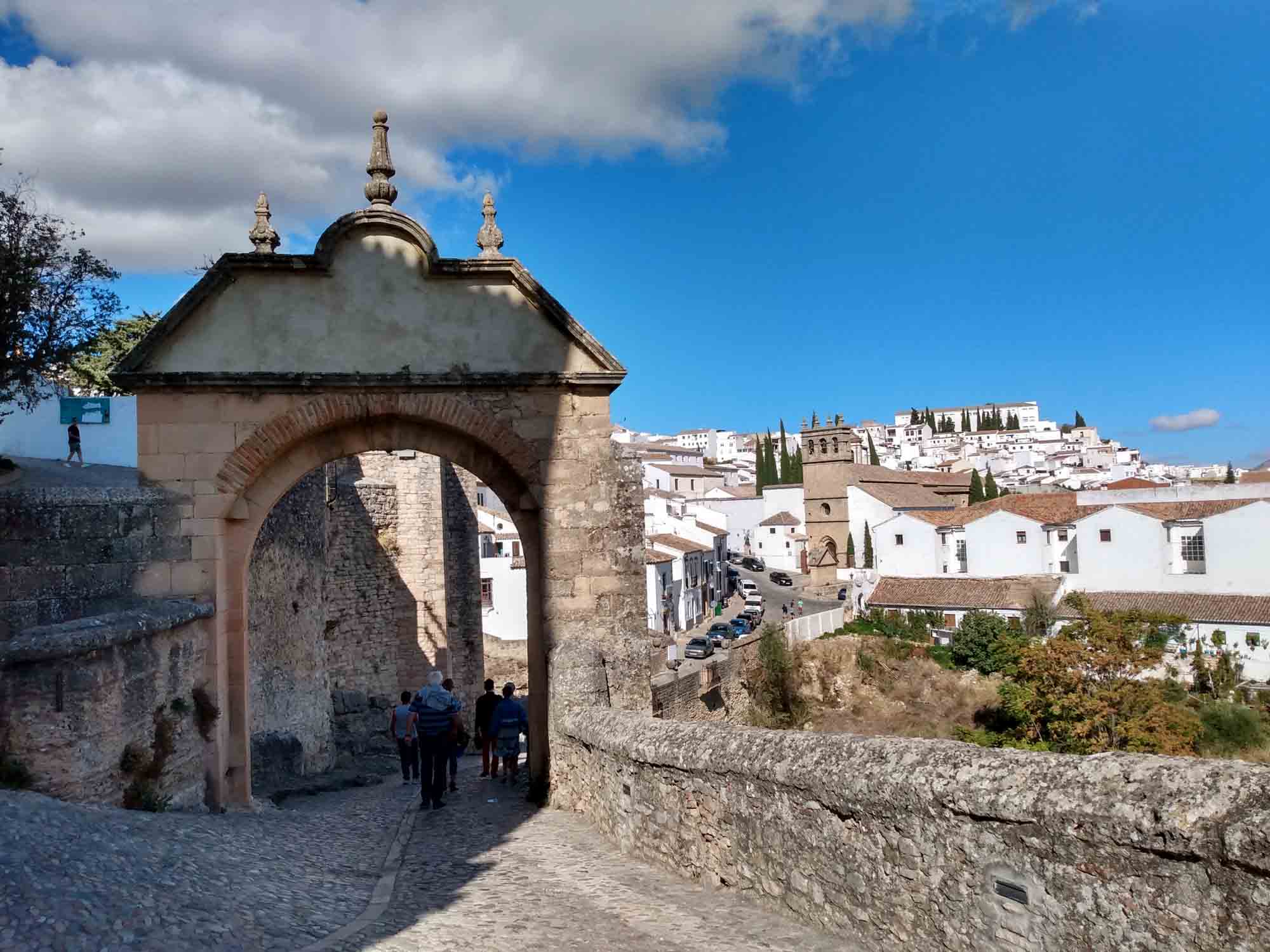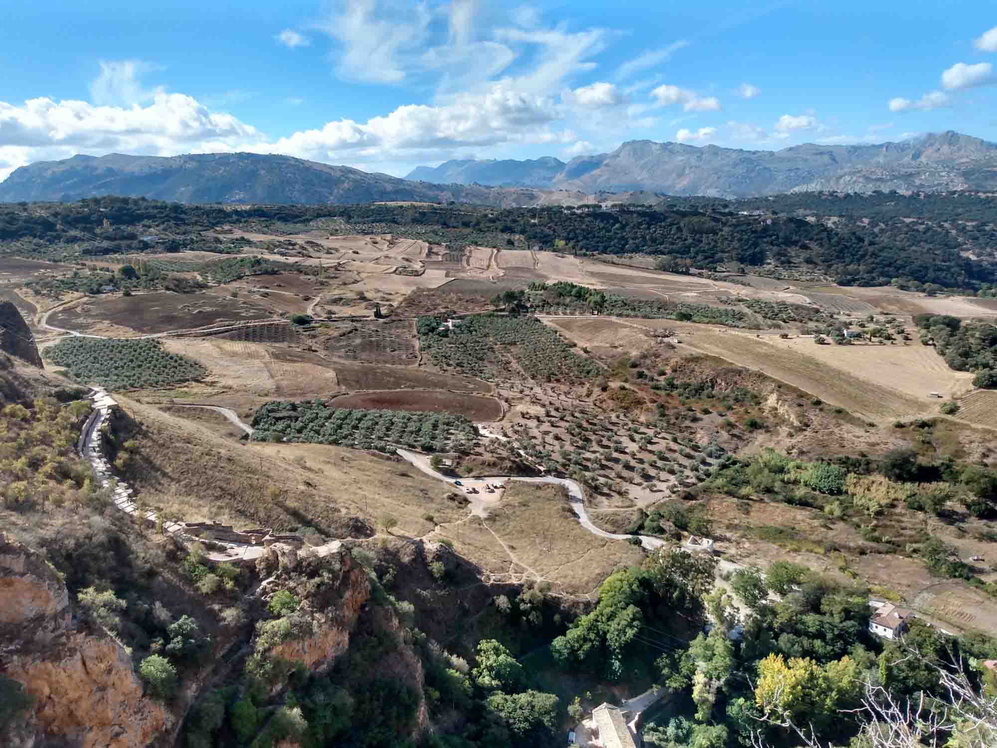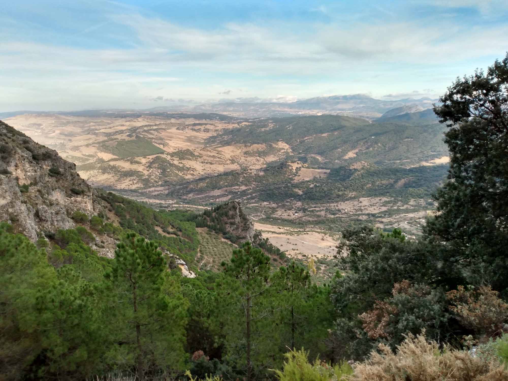 Die kurze Fahrt nach Ronda war unspektakulär. Der Weg durch die Stadt, die auf einem Hochplateau liegt und durch eine 100 m tiefe Schlucht geteilt ist, die der Fluß Guadalevin gegraben hat, dagegen schon mehr. Auf der schmalen Straße kamen uns relativ viele Autos entgegen, die zum Glück aufmerksam genug waren, an passenden Stellen zu halten. Obwohl in Spitzenzeiten bis zu 75.000 Besucher am Tag in diese kleine Stadt strömen, gab es keine größeren Parkplätze. Wir fanden für unseren Kleinen eine Lücke in einiger Entfernung zur Altstadt. Dorthin gingen wir dann zu Fuß. Die Iglesia de Santa Maria la Mayor schauten wir uns nur von außen an, genauso wie die Stierkampfarena, eine der ältesten in Spanien. Ronda ist als der Geburtsort des Stierkampfs bekannt. Wir aber waren vor allem wegen der neuen Brücke hier, die den Guadalevin überspannt und die beiden Teile der Stadt verbindet. Etwas weiter unterhalb gibt es dann noch eine alte Brücke und direkt darunter noch eine Brücke aus der Zeit der Mauren. Aber erst die neue Brücke, die im 18. Jahrhundert gebaut wurde, ermöglicht einen ebenerdigen Übergang zwischen den Stadtteilen. Von der Brücke hatten wir einen schönen Blick über das Land aber die richtige Ansicht gibt es natürlich von unten. Also gingen wir zum Auto zurück und fuhren einen jetzt wirklich schmalen Weg, der zudem relativ steil war auf Kopfsteinpflaster in das Tal hinunter. Nach dem ersten Drittel dann der Schock: Ein Auto parkte so ungünstig, dass an ein Durchkommen eigentlich nicht zu denken war: Rechts noch ein Verteilerkasten und dahinter der Straßenrand mit einem Absatz von ca. 15 cm. Zurück wäre es nur rückwärts gegangen und das mit der rauchenden Kupplung hatten wir ja schon. Also vorwärts und irgendwie passte es dann doch. Unten angekommen packten wir unsere Drohne aus und machten eine schöne Aufnahme aus der Luft. Dann mussten wir leider wieder zurück. Diesmal hatten wir Pech mit dem Gegenverkehr. Kurz nachdem wir die steilste Stelle passiert hatten, standen, weil sie gerade den Wagen vor uns durchgelassen hatten, ein PKW und ohne Abstand dahinter eine Gruppe Motorräder so im Weg dass wir nicht weiterkamen. Zudem war auf der rechten Seite ein Olivenbaum, so dass wir auch nicht ausweichen konnten. Zurück ging auch nicht, da wir an der steilen Stelle, die wir gerade hinter uns gelassen hatten, nicht wieder hätten anfahren können. Nach kurzer Diskussion versuchte der Fahrer des PKWs etwas Platz zu machen. Der Motorradfahrer dahinter war jedoch weniger kooperativ. Demonstrativ fuhr er direkt vor unser Auto, quetsche sich dann zur Fahrerseite durch, ließ ein paar italienisch klingende Haßtiraden durch unserer offenes Seitenfenster ab und fuhr dann, mit seinen Seitenkoffern unser Heck knapp verpassend, wütend weiter. Aber jetzt hatte der PKW genügend Platz und nach kurzem Rangieren kamen wir durch. Dann kam die Stelle, an der wir bei der Herfahrt schon unsere Probleme hatten. Es war eng. Sehr eng. Aber es gelang uns, gerade noch auf dem Asphalt zu bleiben, kurz vor dem unglücklich parkenden Wagen wieder einzuscheren und den Verteilerkasten mit 2 cm Abstand zu passieren. Das letzte Stück war dann kein Problem mehr. Von der Ausfahrt trennten uns jetzt nur noch der Transporter vor uns und der LKW von Repsol, der in ein Haus Gasflaschen lieferte. Das Ganze beschleunigte sich erheblich, als der Ambulanzwagen, der hinter uns aufgetaucht ist, seine Sirene anschaltete. Dann hatten wir es endlich geschafft. Danach fuhren wir zum Einkaufen und zu unserem nächsten Nachtlager an einem zu dieser Jahreszeit ausgetrockneten See. Wir liefen Abends noch bis zu einem Pegelmesser, der unweit des Ufers im Boden steckte. Danach machten wir uns ein kleines Abendbrot und entspannten uns von den Ereignissen des Tages.