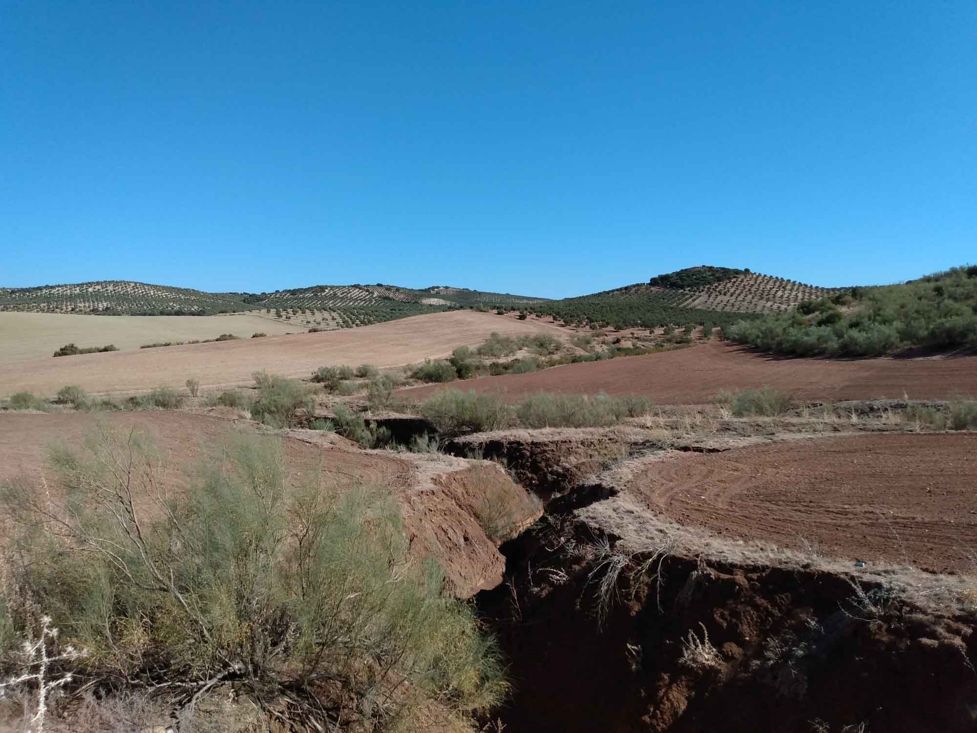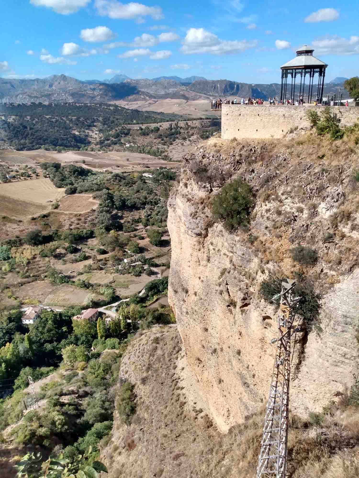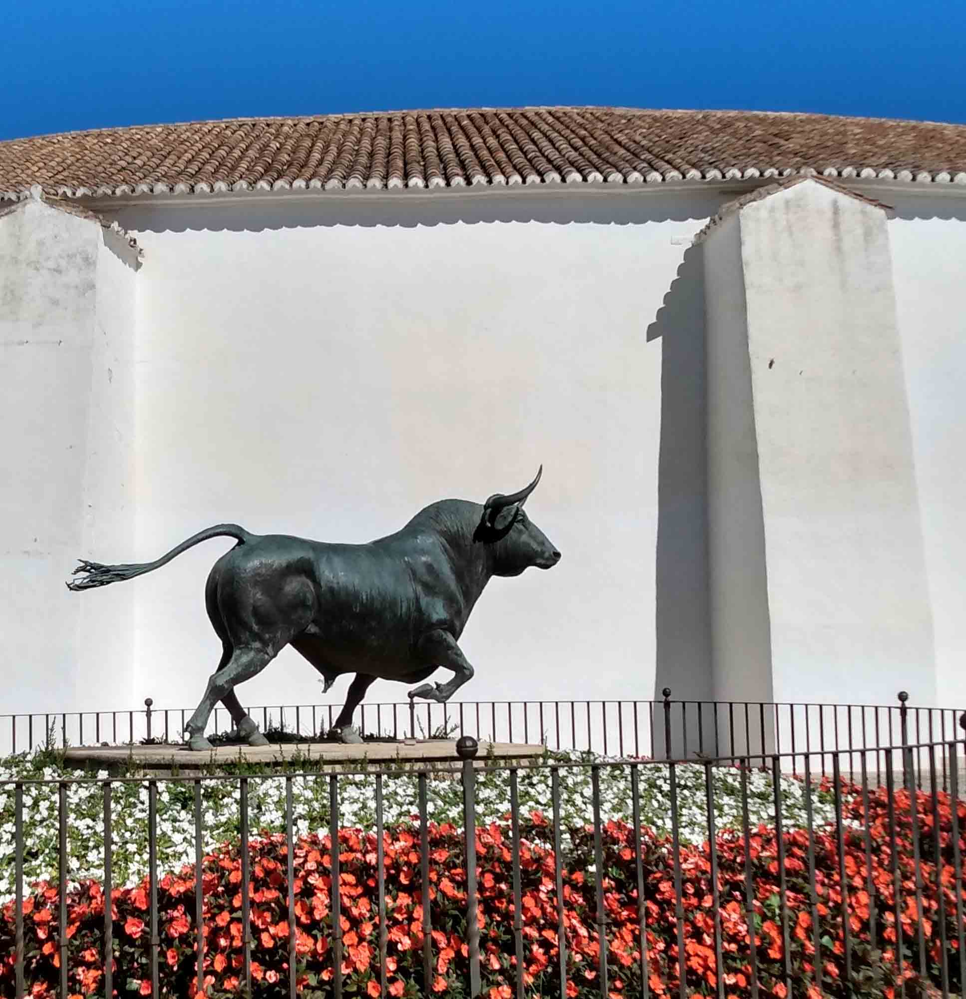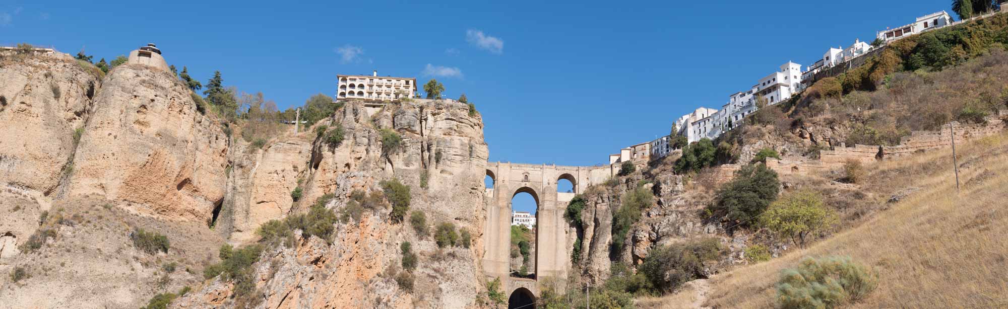 Die kurze Fahrt nach Ronda war unspektakulär. Der Weg durch die Stadt, die auf einem Hochplateau liegt und durch eine 100 m tiefe Schlucht geteilt ist, die der Fluß Guadalevin gegraben hat, dagegen schon mehr. Auf der schmalen Straße kamen uns relativ viele Autos entgegen, die zum Glück aufmerksam genug waren, an passenden Stellen zu halten. Obwohl in Spitzenzeiten bis zu 75.000 Besucher am Tag in diese kleine Stadt strömen, gab es keine größeren Parkplätze. Wir fanden für unseren Kleinen eine Lücke in einiger Entfernung zur Altstadt. Dorthin gingen wir dann zu Fuß. Die Iglesia de Santa Maria la Mayor schauten wir uns nur von außen an, genauso wie die Stierkampfarena, eine der ältesten in Spanien. Ronda ist als der Geburtsort des Stierkampfs bekannt. Wir aber waren vor allem wegen der neuen Brücke hier, die den Guadalevin überspannt und die beiden Teile der Stadt verbindet. Etwas weiter unterhalb gibt es dann noch eine alte Brücke und direkt darunter noch eine Brücke aus der Zeit der Mauren. Aber erst die neue Brücke, die im 18. Jahrhundert gebaut wurde, ermöglicht einen ebenerdigen Übergang zwischen den Stadtteilen. Von der Brücke hatten wir einen schönen Blick über das Land aber die richtige Ansicht gibt es natürlich von unten. Also gingen wir zum Auto zurück und fuhren einen jetzt wirklich schmalen Weg, der zudem relativ steil war auf Kopfsteinpflaster in das Tal hinunter. Nach dem ersten Drittel dann der Schock: Ein Auto parkte so ungünstig, dass an ein Durchkommen eigentlich nicht zu denken war: Rechts noch ein Verteilerkasten und dahinter der Straßenrand mit einem Absatz von ca. 15 cm. Zurück wäre es nur rückwärts gegangen und das mit der rauchenden Kupplung hatten wir ja schon. Also vorwärts und irgendwie passte es dann doch. Unten angekommen packten wir unsere Drohne aus und machten eine schöne Aufnahme aus der Luft. Dann mussten wir leider wieder zurück. Diesmal hatten wir Pech mit dem Gegenverkehr. Kurz nachdem wir die steilste Stelle passiert hatten, standen, weil sie gerade den Wagen vor uns durchgelassen hatten, ein PKW und ohne Abstand dahinter eine Gruppe Motorräder so im Weg dass wir nicht weiterkamen. Zudem war auf der rechten Seite ein Olivenbaum, so dass wir auch nicht ausweichen konnten. Zurück ging auch nicht, da wir an der steilen Stelle, die wir gerade hinter uns gelassen hatten, nicht wieder hätten anfahren können. Nach kurzer Diskussion versuchte der Fahrer des PKWs etwas Platz zu machen. Der Motorradfahrer dahinter war jedoch weniger kooperativ. Demonstrativ fuhr er direkt vor unser Auto, quetsche sich dann zur Fahrerseite durch, ließ ein paar italienisch klingende Haßtiraden durch unserer offenes Seitenfenster ab und fuhr dann, mit seinen Seitenkoffern unser Heck knapp verpassend, wütend weiter. Aber jetzt hatte der PKW genügend Platz und nach kurzem Rangieren kamen wir durch. Dann kam die Stelle, an der wir bei der Herfahrt schon unsere Probleme hatten. Es war eng. Sehr eng. Aber es gelang uns, gerade noch auf dem Asphalt zu bleiben, kurz vor dem unglücklich parkenden Wagen wieder einzuscheren und den Verteilerkasten mit 2 cm Abstand zu passieren. Das letzte Stück war dann kein Problem mehr. Von der Ausfahrt trennten uns jetzt nur noch der Transporter vor uns und der LKW von Repsol, der in ein Haus Gasflaschen lieferte. Das Ganze beschleunigte sich erheblich, als der Ambulanzwagen, der hinter uns aufgetaucht ist, seine Sirene anschaltete. Dann hatten wir es endlich geschafft. Danach fuhren wir zum Einkaufen und zu unserem nächsten Nachtlager an einem zu dieser Jahreszeit ausgetrockneten See. Wir liefen Abends noch bis zu einem Pegelmesser, der unweit des Ufers im Boden steckte. Danach machten wir uns ein kleines Abendbrot und entspannten uns von den Ereignissen des Tages.