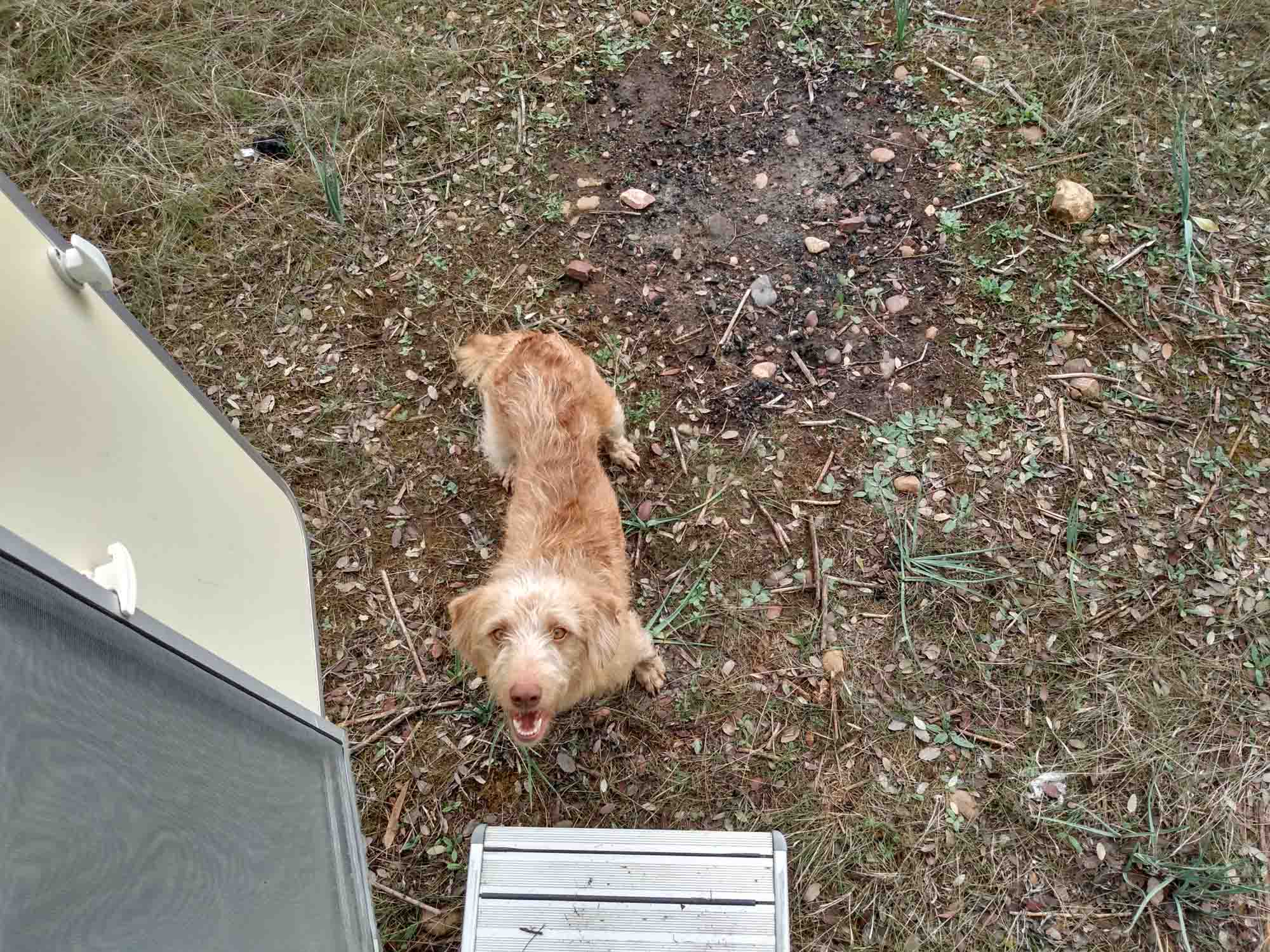 Als wir morgens aufstanden, waren die Franzosen wie gehofft bereits abgefahren. Es war etwas bedeckt, aber trotzdem warm genug, dass wir den Tag draußen verbringen konnten. Bis auf eine niedliche Hündin, die immer mal wieder zum Spielen vorbeikam, waren wir allein und konnten die Ruhe in dieser herrlichen Abgeschiedenheit genießen.