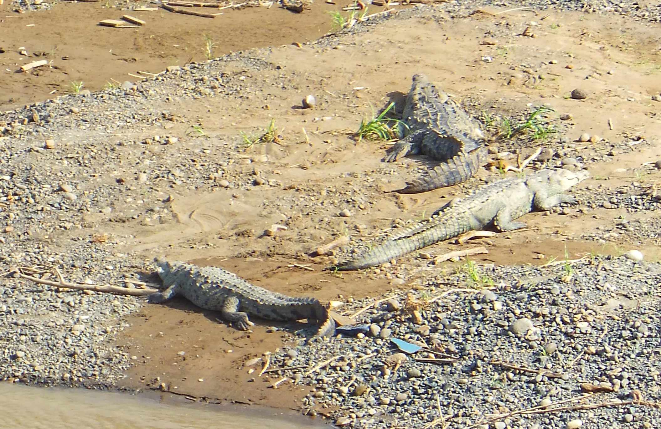 Trotz der gestrigen Aufregung haben wir hier sehr gut geschlafen und brachen um 10 Uhr in Richtung Quepos auf. Da wir keine Rucksäcke mehr hatten, mussten wir unsere Wertsachen in AirFrance-Jutebeutel verstauen, was ein merkwürdiger Anblick war. Das neue Auto hat funktionierende Stoßdämpfer und somit konnten wir die Landschaft sehr genießen. Vor einer Brücke, an einem kleinen Parkplatz mit Gaststätte und Souvenirshop hielten wir an, weil wir ein tolles Strandtuch erspähten. Der Parkwächter kam auf uns zu und meinte, er würde auf unser Auto aufpassen, solange wir uns die Krokodile anschauen würden. Es stellte sich heraus, dass wir zufällig den Ort fanden, den wir zuvor vergebens gesucht hatten. Die Brücke am Rio Grande bei Tarcoles. Unten am Fluss leben Krokodile in ihrem natürlichen Habitat und können von der Brücke aus bestaunt werden. Glück muss man haben! Als wir in Quepos ankamen, haben wir erstmal eine Soda mit WiFi aufgesucht, um den Besitzer unserer Unterkunft per E-Mail zu kontaktieren. Es fällt schmerzlich auf, wie leicht das Leben mit Smartphone und WhatsApp ist. Aber es klappt auch so, und schließlich holt uns jemand ab und wir fahren gemeinsam zu unserem Chalet im Dschungel. Der Eigentümer, ein rüstiger und sehr freundlicher älterer Herr, zeigte uns alles und wir merkten sofort, dass uns dieses einsame kleine Häuschen sehr schöne letzte Tage schenken wird. Wir hatten geplant, für die nächsten Tage unseren Einkauf zu erledigen und dann in der netten kleinen Soda zu Abend zu essen. Leider hatte die Soda um 19 Uhr bereits geschlossen und so entschlossen wir uns, noch einen Fisch im Supermarkt zu kaufen und selbst zu kochen. Mit den Geräuschen des Dschungels schliefen wir irgendwann wohlig ein.