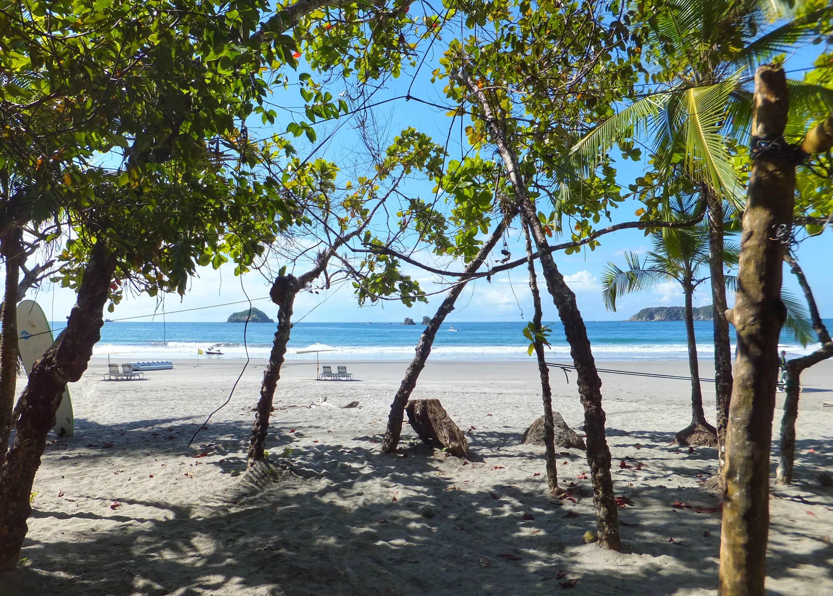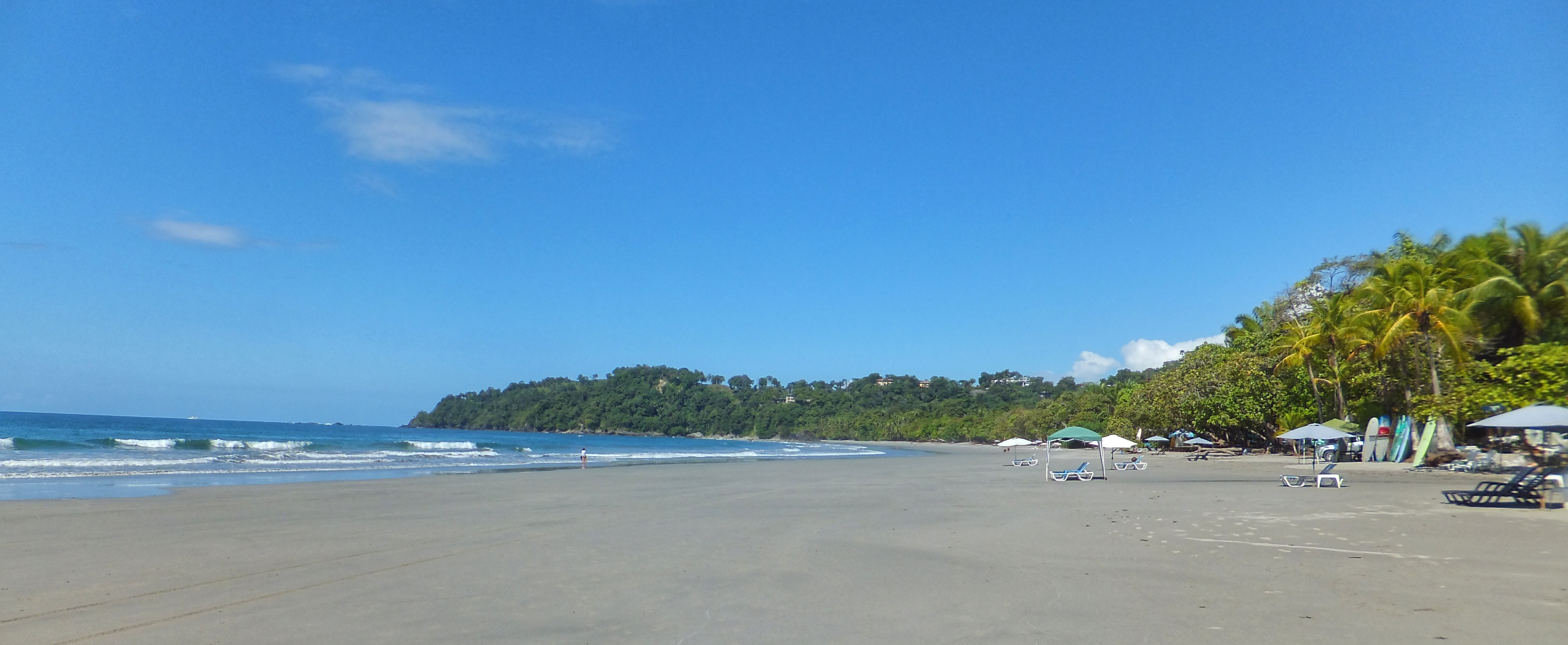 Von Playa de Coco hieß es, dass dies ein absoluter Traumstrand sein sollte. Wie sehr waren wir doch von der Realität enttäuscht. Ganz anders der Playa Espanillo, an dem wir heute den Tag verbracht haben: Weicher weißer warmer Sand in einer wunderschönen Bucht, palmenumsäumt und nicht allzu sehr besucht. Unser bisheriges Highlight, was den Strand angeht. Da uns die Sonnencreme ebenfalls gestohlen wurde, musste es heute ohne gehen und obwohl die Sonne den ganzen Tag schien, machte dies unserer gebräunten Haut nichts mehr aus. Zum Sonnenuntergang fuhren wir zurück zu unserer Dschungellodge. Bei der Durchfahrt entdeckten wir auf einem Baum mehrere Aras, die sich dort über die Früchte hermachten. Wir machten uns frisch und gingen dann in die Soda, die heute bis um 20 Uhr geöffnet hatte und aßen unsere geliebte Casado.