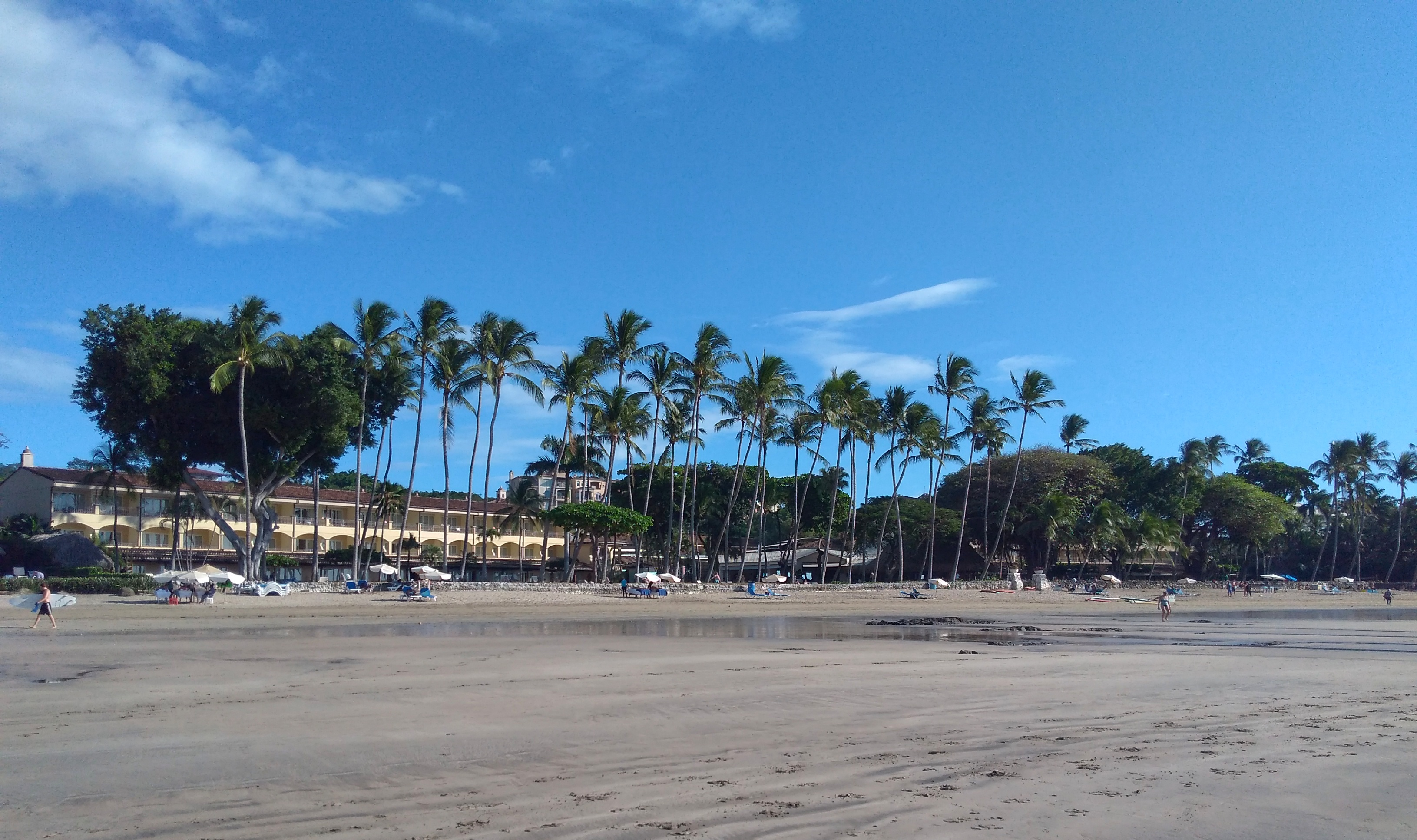 Morgens hat uns eine Gruppe Franzosen geweckt, die gestern im Hotel eingecheckt haben. Um 6:30 ging erst eine laute Musik an, dann konnten wir eine Stunde lang mithören, wie sie frühstückten, ihre Sachen packten und zu einem Ausflug aufbrachen. Um halb acht war wieder Ruhe und wir wach. Wir frühstückten und fuhren dann etwas früher als üblich los zum Playa Grande, einem Strand innerhalb des Naturschutzgebiets Marina del Baulas. Unterwegs kauften wir noch ein Beachball-Set, das wir am Strand ausgiebig genutzt haben. Der Strandabschnitt, den wir uns ausgesucht haben, war menschenleer und nur gelegentlich kamen ein paar Strandspaziergänger vorbei. Wir hatten eine kleine Stichstraße durch den Urwald gefunden, die direkt bis an den Strand führte. Hier waren wir ganz alleine, genossen die Sonne, den Strand und die Wellen und zum Mittagessen eine Papaya. Als die Sonne unterging fanden wir auf halbem Weg nach Tamarindo eine gemütliche kleine Soda, in der wir zu Abend aßen. Wir hatten überhaupt keine Lust auf die Franzosen und gingen nur kurz ins Hotel, um uns frisch zu machen. Danach liefen wir zum Strand in Tamarindo, besorgten uns bei Pops ein großes Eis und spielten gemütlich bei Livemusik und Cocktails am Strand solange bis in der Bar die Tische zusammengeräumt wurden. Als wir wieder im Hotel ankamen waren die Franzosen bereits schlafen gegangen.